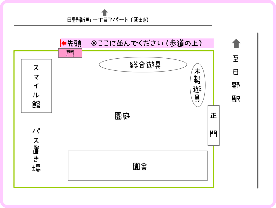 日野しらゆり幼稚園 下の図の場所に並んでお待ちください。 ※当日入会金2,000円をお持ちください。 |