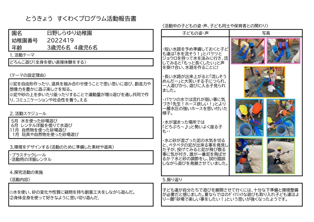 本園では、今年東京都すくわくプログラムの取り組みとして「砂場から展開するあそび」をテーマに異年齢、少人数のグループに分かれ全4回活動を行いました。昨年の砂場遊びの気付きから園庭に新たな水道を設置し、子ども達の遊びが広がった様子や、発見・会話をまとめたものになります。是非ご覧ください。